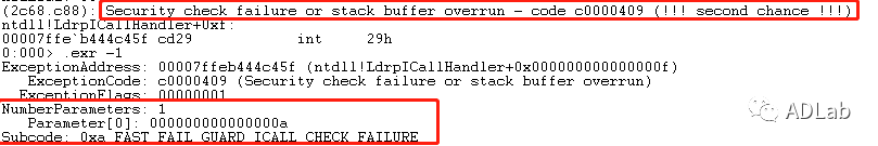 ÔÚÉÏͼÖУ¬£¬£¬³ÌÐòÖÕÖ¹ÓÚint 29h£¬£¬£¬¶øËüµÄ²ÎÊýΪ0xa£¬£¬£¬¶ÔÓ¦FAST_FAIL_GUARD_ICALL_CHECK_FAILURE£¬£¬£¬ÓÉ´ËÍÆ¶ÏÎÊÌâ¿ÉÄÜ·ºÆðÔÚCFGµÄ¼ì²éÀú³ÌÖС£¡£¡£¡£