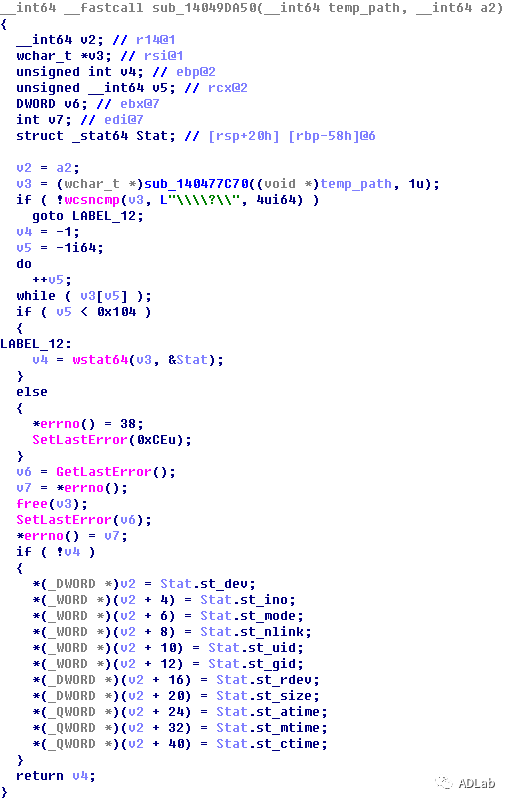 Ê×ÏÈ£¬£¬£¬º¯Êýsub_14049DA50ͨ¹ýsub_140477C70¶Ô×Ö·û´®¾ÙÐÐÁË´¦Öóͷ£¡£¡£¡£¡£È»ºó£¬£¬£¬Å²ÓÃwstat64»ñÈ¡ÏìӦ·¾¶µÄÎļþ״̬£¬£¬£¬ÈôÊÇÀֳɻñÈ¡ÔòÉúÑĵ½Ò»¸ö½á¹¹ÌåÖУ¬£¬£¬²»È»·µ»Ø0xffffffff¡£¡£¡£¡£ÓÉÓÚTempĿ¼Ï²¢Î´·¢Ã÷±¸·ÝÎļþ£¬£¬£¬µ¼Ö»ñȡ״̬ʧ°Ü£¬£¬£¬´Ó¶ø·µ»Ø0xffffffff¡£¡£¡£¡£
