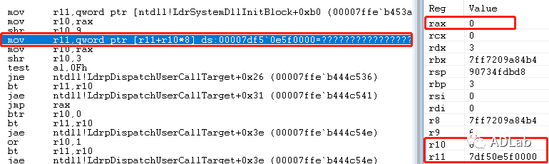 ¼ÌÐøÍùÏÂÖ´ÐУ¬£¬£¬½«rsiÖÐ0Öµ¸³Öµµ½raxÖУ¬£¬£¬È»ºóŲÓÃ0x7ff8fab0c510´¦£¬£¬£¬¼´ntdll!LdrpDispatchUserCallTarget¡£¡£¡£¡£
